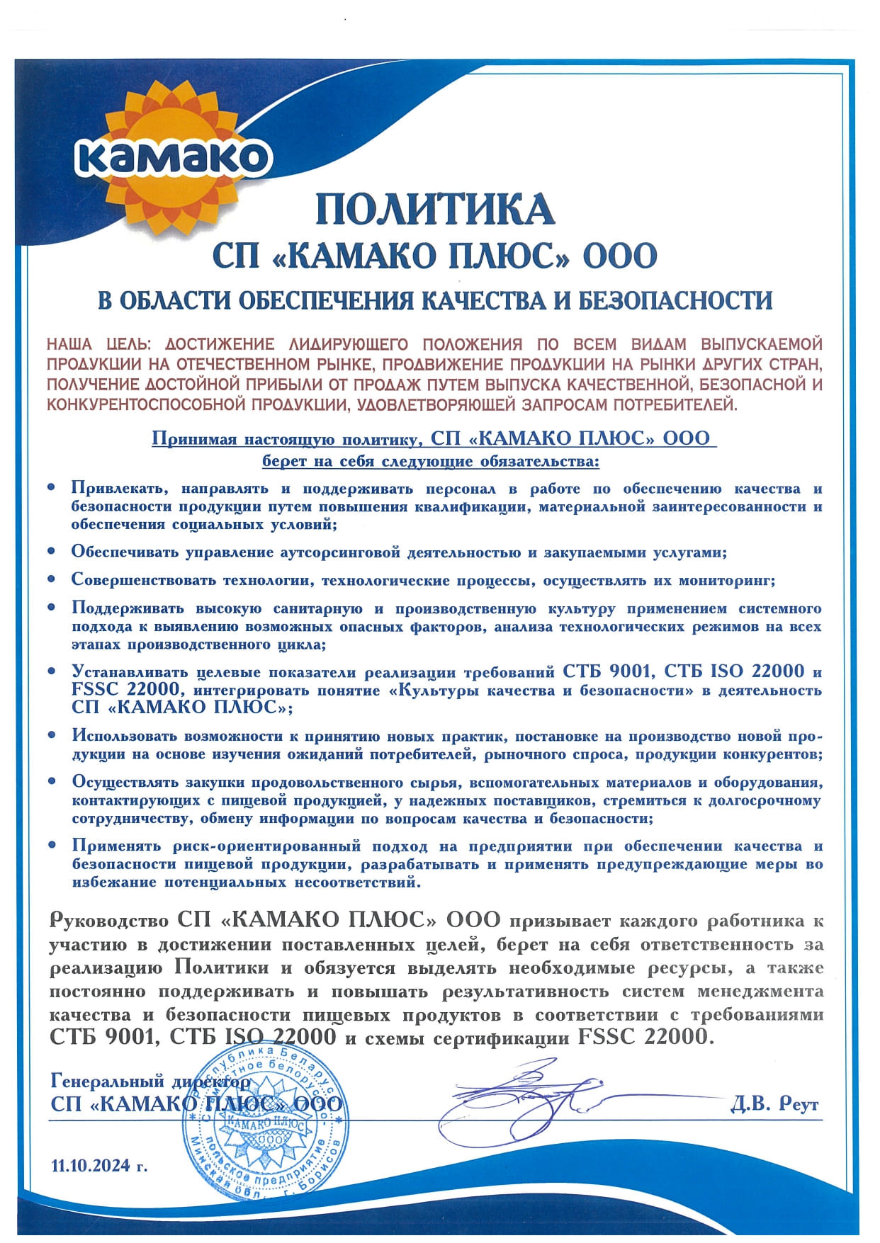 В условиях роста требований к безопасности продуктов питания компания «КАМАКО» стремится опережать ожидания потребителей и партнёров. Именно поэтому мы внедрили систему управления безопасностью пищевой продукции, соответствующую требованиям СТБ ISO 22000-2020 — одного из наиболее авторитетных международных стандартов в этой сфере.