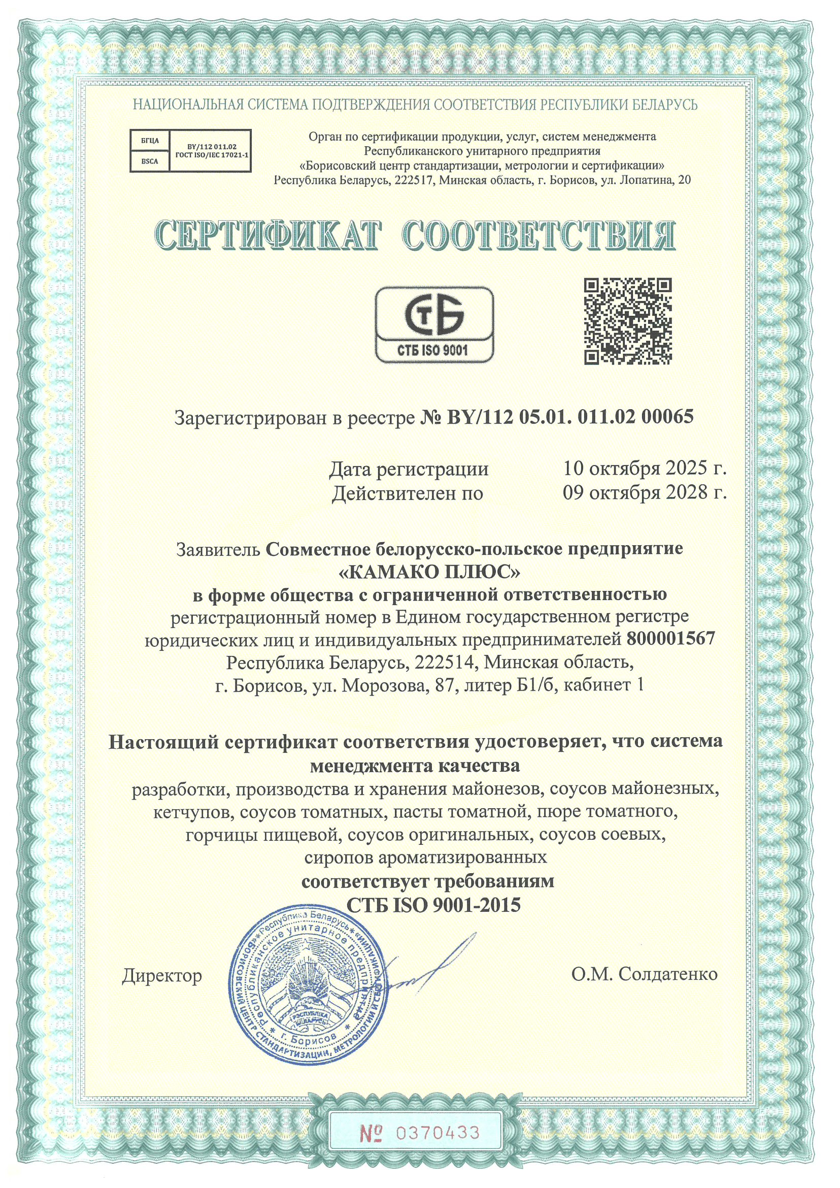 В компании «КАМАКО» качество продукции — не просто стандарт, а принцип, лежащий в основе всей нашей деятельности. Мы убеждены, что устойчивое развитие возможно только при строгом соблюдении высоких требований к качеству и безопасности. Именно поэтому мы внедрили и постоянно совершенствуем систему менеджмента качества, соответствующую требованиям СТБ ISO 9001-2015.